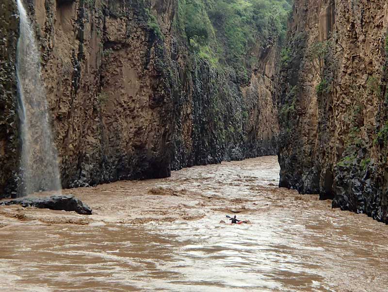The Tis Abay section from Lake Tana to Tissisat has a number of class II, III, IV, and V rapids but is generally in open country with a wide riverbed and the river often divides into many channels with several options available. The first major rapid about 6 km downstream from the lake is called Jordi Falls (IV) followed a few km downstream by the steeper Arafami Falls (V). There are many more drops with multiple channels on the way to Tis Abay (Tisissat Falls). The flow out of the lake is controlled by a regulating dam. During the years 2001-2012, the river usually had a constant ~110 cms released into it (+tributary addition) to generate power at the Tis Abay powerhouse all year long. However, now due to the Tana-Beles hydro diversion project removing water from Lake Tana all year into the Beles River, this section gets only an average of ~30 cms - with levels dependent on overall lake levels. Nowadays, during much of the year, the upper part of the run will not have enough water to raft. The best time of year to likely find fun flows in the upper ~25 km is Sep-Nov when releases from the lake will lilkely be 30-70cms (1000-2300 cfs), while the lower ~15 km should have good flows Jul-Dec from a combination of outflow and tributaries entering. The section ends at Tisissat Falls, a ~40 m two-tiered drop and the iconic symbol of the Blue Nile. A dirt road leads to the powerhouse and falls from near the lake - and continues beyond it about 2 km, so it is easy to skip this section and put in downstream, avoiding a potentially boney section of river if there is inadequate release from the lake (it also avoides the portage of the falls and the difficult gorge just downstream). We generally start our raft trips just downstream of the falls by the Tul confluence.