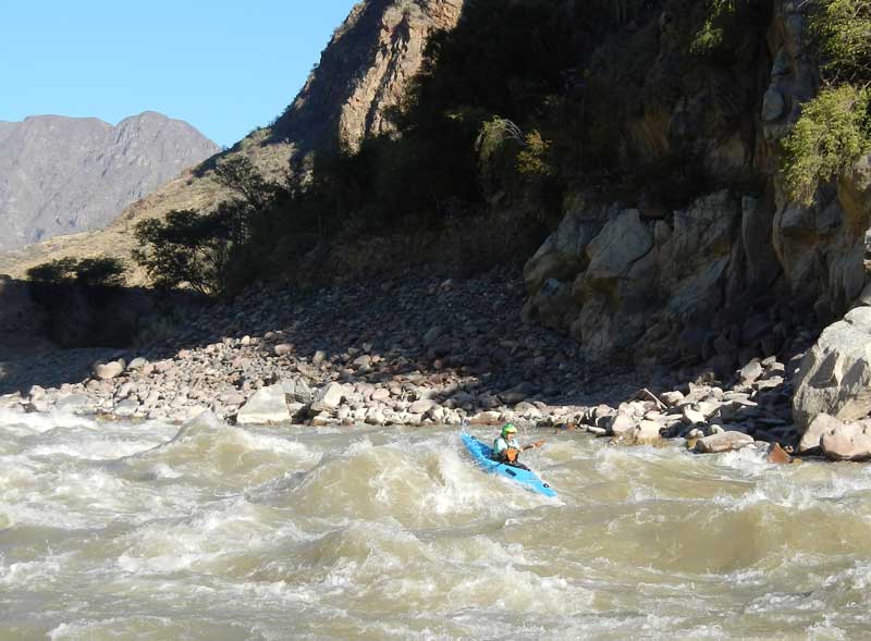 The Lower Grand Canyon Amazon section is class III-IV with rapids interspersed throughout its length. It is equivalent in difficulty to the Grand Canyon of the Colorado, MF-Main Salmon, or Sun Kosi. The biggest rapids are El Choclón, Tupén Grande, San Lucas, Playa El Inca, Magdalena, and Linlín. Although some of these rapids are quite long, they are not more difficult than the toughest rapids on the Grand Canyon Colorado, even at high flows. The scenery of the Lower Grand Canyon Amazon is pleasant, starting out in a dry cactus-studded canyon and getting more and more annual precipiation with additional vegetation before becoming quite dry again in the Bagua Valley section. Side excursions include visits to abandoned pre-Incan overlooks and Incan tombs, to narrows, to the pueblos of Mendán or Tupén Grande, to a huge cavern, and to an intriguing series of swiming pools. It is important to have approval of the local communities in this section as they can be hostile to you if they don't know you (see C&K article; but read comments at end). This section has the dams in the latest planning stages: Chadin 2 and Veracruz. It will likely be the first to be drowned by reservoirs. The first take-out as the canyon opens up is Puerto Malleta, about a 1.5 hr drive from Jaén. From here, it is possible to paddle up to 80 km through the Cumba Valley section (class I-II) to Rentema, where the Jungle Pongos begin. Two dams (Chadin2 and Veracruz) are already approved to be built and will flood the entire Lower Grand Canyon section, but residents and SierraRios opposition have temporarily delayed the Chadin2 project (Veracruz is still moving forward as of 2016).