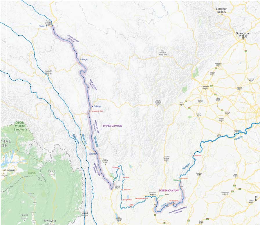 (9) GREAT BEND (280km; 1600m-1170m; 1.6m/km; class IV-V; Dagoutou to Shangliucun): This section had amazing canyon scenery, huge beaches, frequent rapids (some quite challenging), and warm weather and as such it was becoming the most popular rafting expedition in China in the 1990s-2000s. The first SOBEK expedition covered 303 km over 10 days total, but later trips and other outfitters (including Earth River and Last Descents) offering the excursion ended up taking out at the bridge closer to Lijiang and covering only ~220 km. As of 2013, iconic rapids named FirstBlood, "FogelsFolly, HungMenKou, QinJiaTan, LaZiTan", SkipsHubris, "MaWeiTan and LastRapid are now all drowned by hydroelectric dams. The river in this section is almost entirely within Yunnan, only bordering Sichuan for a few km on the RL side at the northermost part of the bend. You can see a little of what this section was like at the following videos: Video_GreatBendLastDescent; SobeksFirstDescent; ShortVideo_GreatBend; and a HistoryFirstDescents_Yangtze. Most of the Great Bend section was drowned by three dams between 2011-2013 (Jinaqiao, Ahai, and Liyuan Dams). Almost none of it remains free-flowing.
