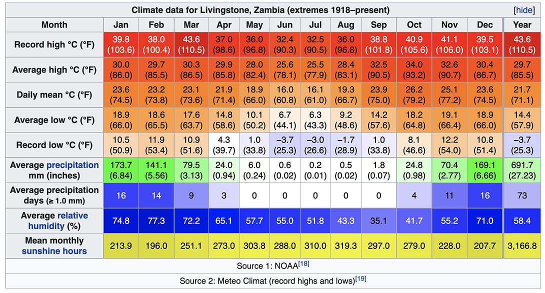 These trips are planned for what is considered the best time of year to raft the river; namely, the lowest water of the year and with the warmest weather with little chance of rain (i.e., the end of the dry sesaon). The climate of the area is tropical monsoon, with the main rainy season Nov-Apr and a cooler dry winter season Jun-Aug. You can see averages for Livingstone in the chart below (also you can see it at Wikipedia_Livingstone; also see MeteoblueClimateAverages_Livingstone). We can expect average highs of ~34°C (93°F) and lows of ~19°C (66°F) during October and November, and generally cooler nights in September to being sometimes cold in August. In November the monsoon rains usually start up, so there may be some afternoons or evenings with precipitation, generally from thunderstorms. In December the rains get much more frequent but the river remains low and safely raftable, while temperatures remain high but moderated day and night by the clouds and rain. During the main rafting season there are generally few mosquitos. On many trips, it is possible to camp out under the stars and not even use a tent. Winds are generally upstream and in the afternoon but light (though sometimes there are windier days). The water temp in the river is usually the average of the air temperature so will likely be ~26°C (80°F) during trips Oct-Nov-Dec - very nice to swim and bathe in (it's cooler in Sep and Aug). Note that the peak flows in the river are delayed by 2-3 months compared to when the rain is falling most, due to the swamps and long distance the water travels from upstream sources.