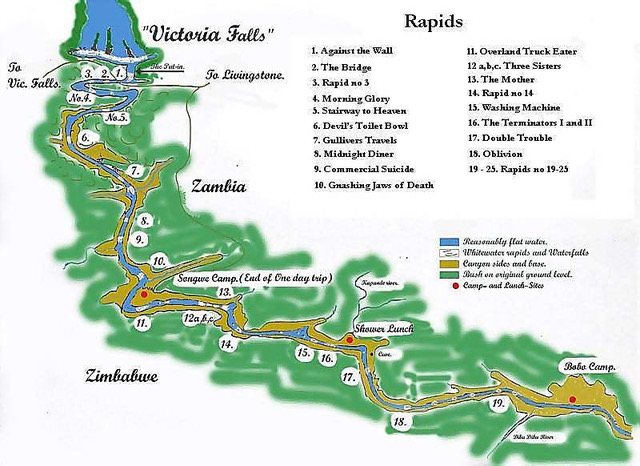 Rapid21 (km 25): Bobo Beach Camp on Zambian side is general day-trip take-out point; Zimbabwe side has access too