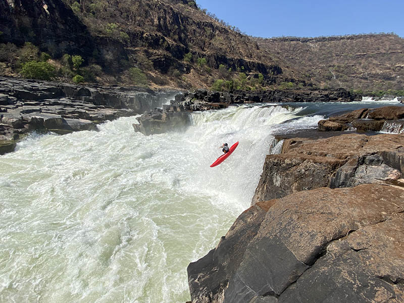 Victoria Falls at ~107m (340 ft) is an impressive natural feature (and actually one of the "Seven Natural Wonders of the World"), but this drop is a major obstacle for the river-runner to pass. The default way this can be done is to stop just upstream of the falls on the Zambian side of the river and have a vehicle shutlte us and gear over to the Boiling Pot Trail that leads the base of the falls - which is where all rafters put in at lower flows. Doing this, we employ local porters to carry the majority of gear down to the river (this is commonly done here). This is the default way to get around the falls and is included in the main trip. However, some of the group can possibly implement a plan to raft right up to the lip of Victoria Falls at or near near Livingstone Island, then lower the gear and some of our participants over the cliff (rappelling) down to the river below [at low water Sep-Oct-Nov-Dec, the Zambian side generally is dry with just a vertical cliff of ~100 m (330 ft) - you can basically walk from near the middle of the river at Livingstone Island to the Zambian side on mostly dry rock with a bit of wading - nearly all the water is falling on the Zimbabwe side. Lowering gear at Livingstone Island also gives the opportunity to run the two Minus rapids (class V), some of the biggest whiteater on the Zambezi. If this plan is implemented, generally only some of the group would work to lower the rafts, kayaks and gear down the cliff to where well start on the river in Batoka Gorge, while others would walk around and meet us at the base on the standard trail down, where all the group would reunite. We have the 200m static lines to do the lowering and rappel. The rappel is fun, quite scenic and very photogenic. Any such rappe would be optional. While we will do our best to assure this is possible, we cannot guarantee it (official permission may be required from Heritage), though to show it can be done safely with minimal disturbance to the environment, several members of our second expedition in 2021 did rappel down the cliff at the falls and lowered a raft and kayak successfully (all went well).