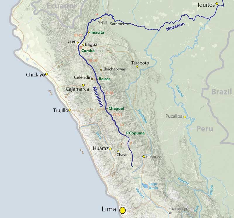 MARAÑON OVERVIEW MAP This shows a general overview of Río Marañon and the various access points. Times are bus routes between general cities. Regular flights are available from Lima to Cajamarca, Chiclayo or Tarapoto. In 2012 there were flights from Trujillo to Chagual on Thursday and Saturday morning. Topo maps of the river are also available.