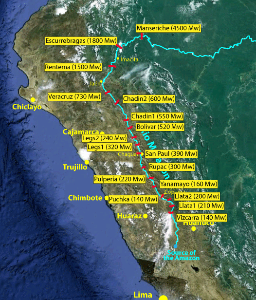 From the PLOS1 article: "More than half (81) of all planned dams are located on the Marañon River and its sprawling tributaries (including the Huallaga, Pastaza, and Zamora Rivers) across Ecuador and Peru (Table 1; Figure S6). Much of the existing hydropower for Ecuador comes from four large dams on two northern tributaries of the Marañon, but the rest of the river complex is free-flowing. However, there are plans for over 60 new dams on these free-flowing stretches. In April 2011, the outgoing administration of President Alan Garcia issued a decree declaring that the construction of 20 of these dams, all located on the main-stem (Marañon), were in the national interest. All 20 of these prioritized Marañon dams would exceed 100 MW, including three new mega dams (Escuprebraga, Rentema, and Manseriche). Also noteworthy is a cluster of large and mega dams slated for the Zamora River and the first large dams for the Huallaga. |