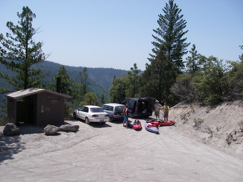 Trailhead parking for Giant Gap of the North Fork American. This run is 14 miles, easy class V, with 55 fpm average gradient.