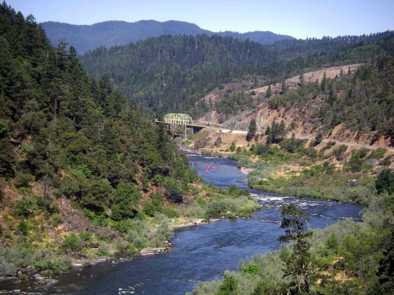 Looking down at Hellgate Bridge on the Rogue River of Southern Oregon, upstream of a popular class III "Wild and Scenic" 35 mile section.