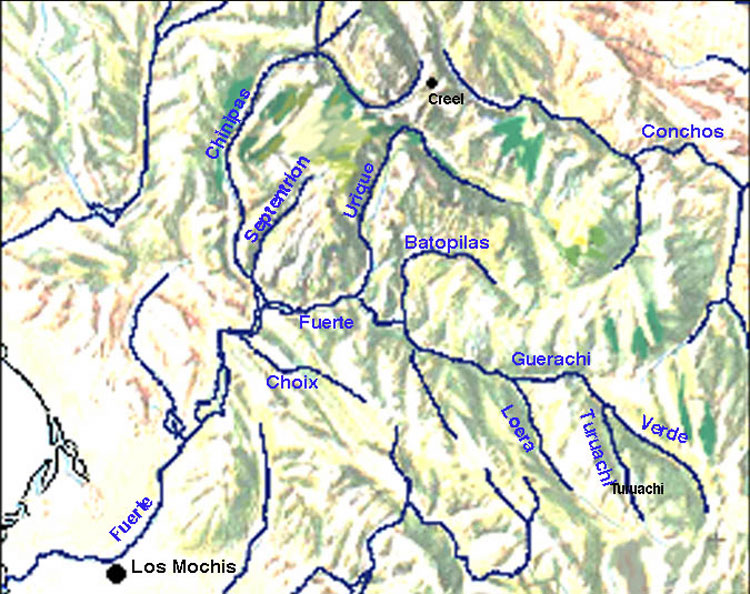 Map of the Rio Fuerte system. The following slides are from the first part of a 10-day, 217-mile expedtion from Turuachi to Presa Huites.